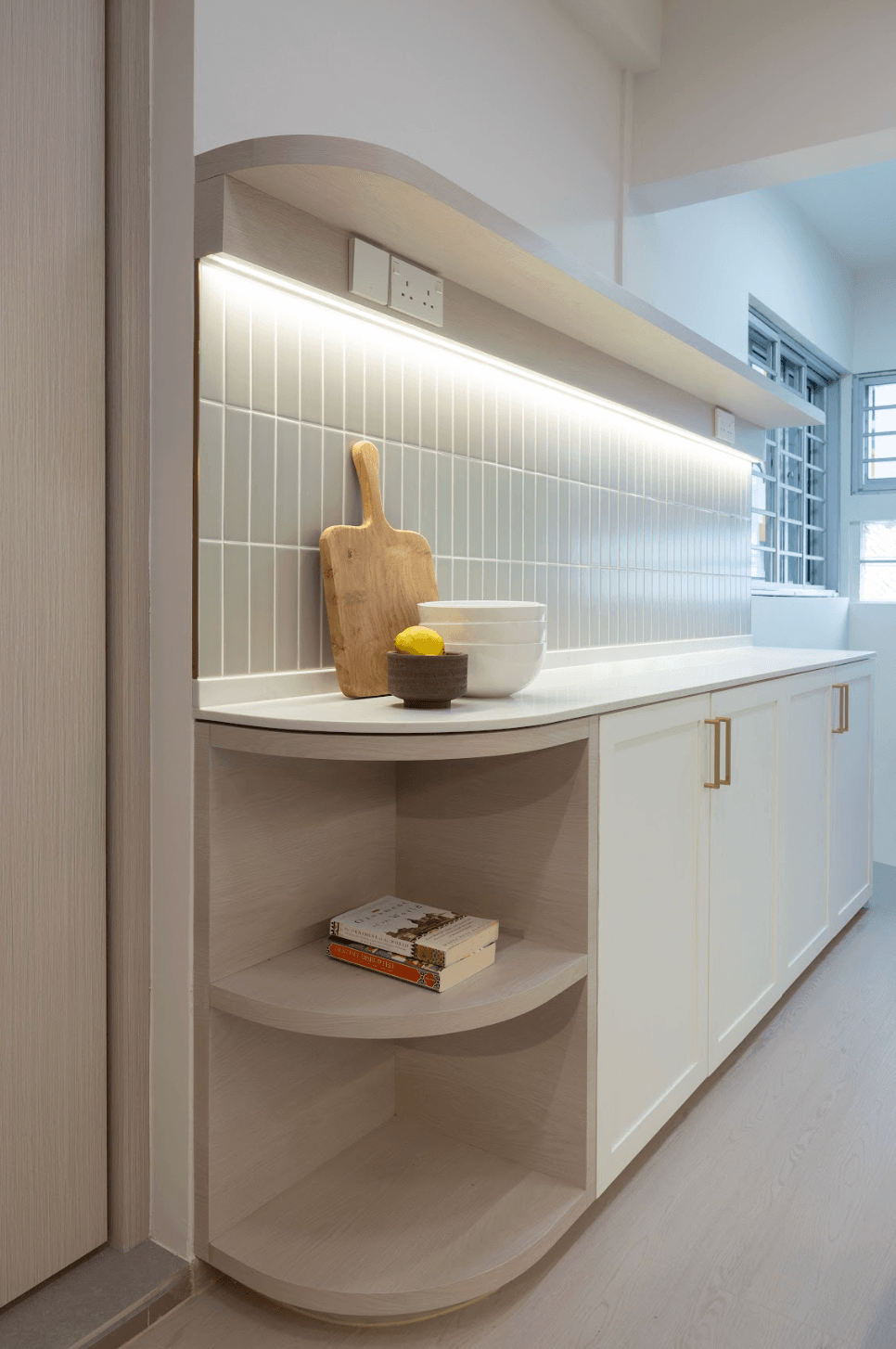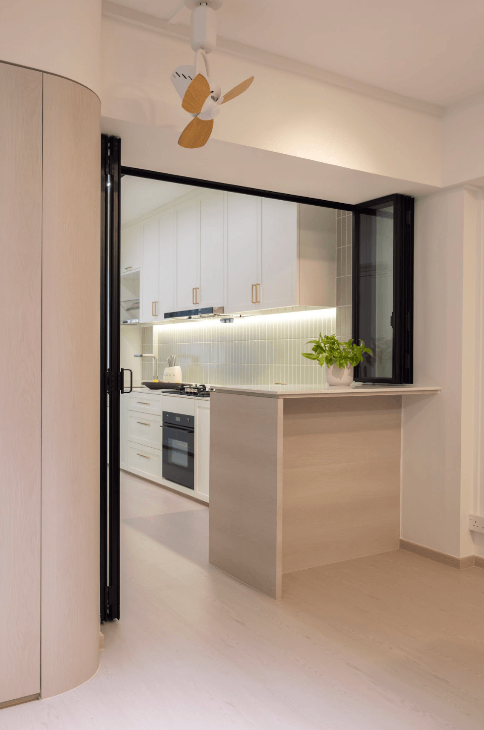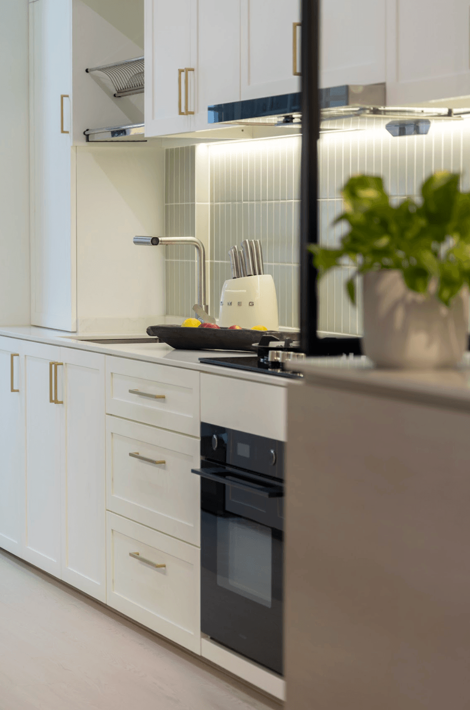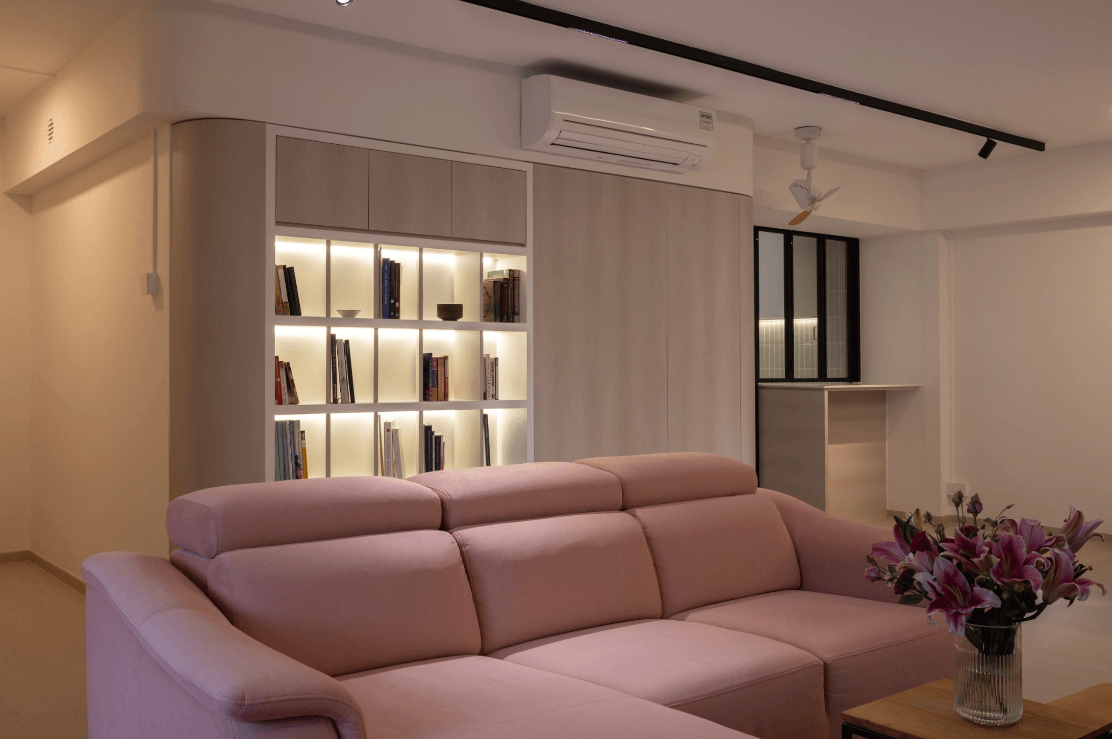 A minimalist home designed for a couple who values quiet moments and a love for reading. The palette is kept soft and soothing to evoke a sense of calm throughout the space. The kitchen features all-white shaker laminate cabinetry paired with brass handles and a pastel green tiled backsplash, adding subtle character without overwhelming the space. In the living area, light wood tones are complemented by pastel accents and a blush-pink sofa, creating a warm and inviting retreat where the homeowners can unwind at the end of the day.