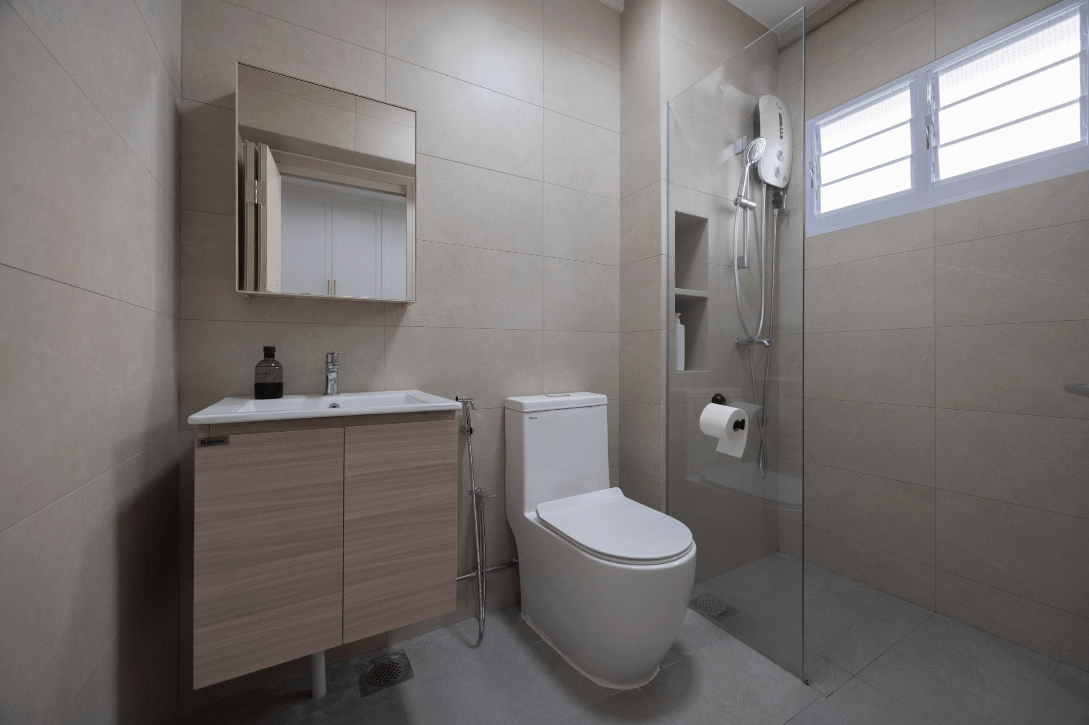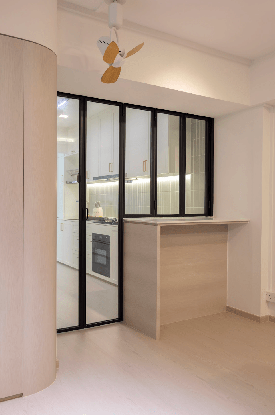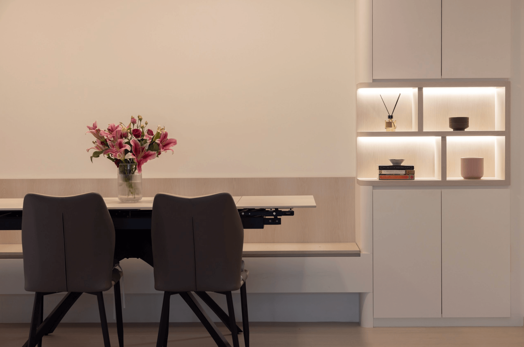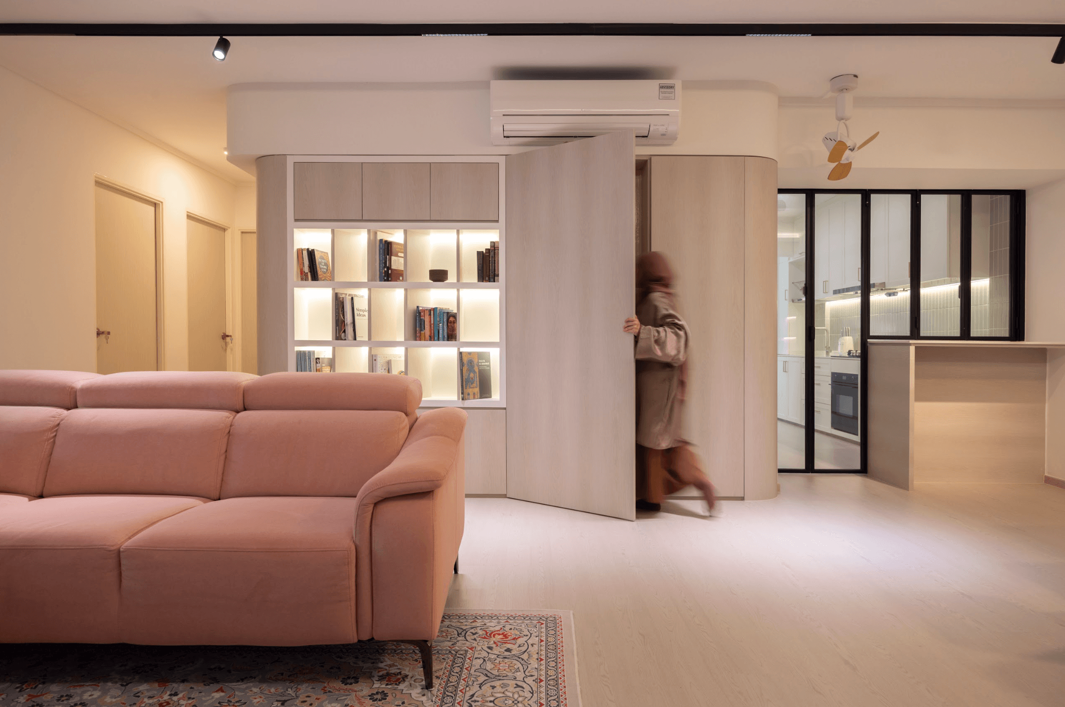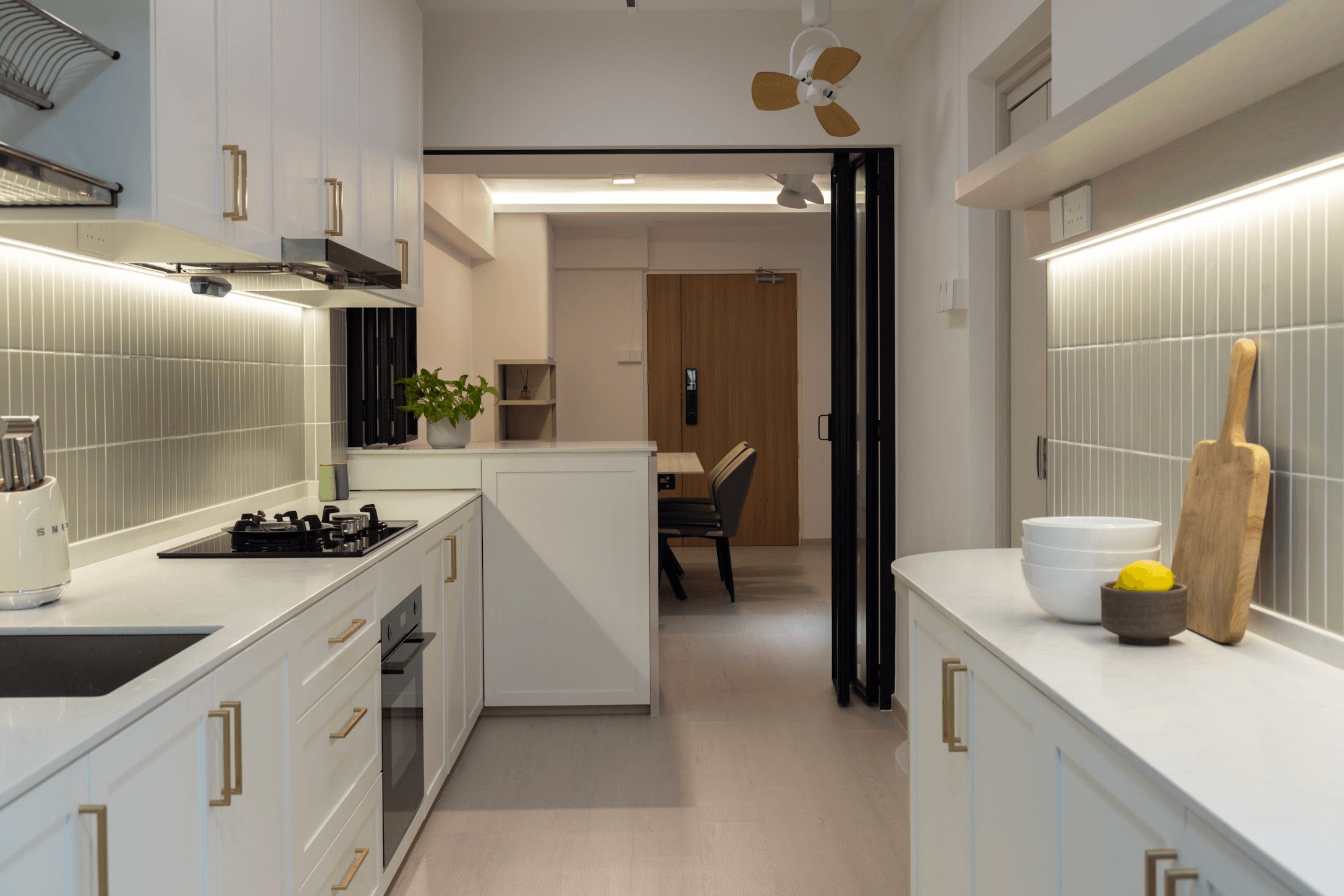 A minimalist home designed for a couple who values quiet moments and a love for reading. The palette is kept soft and soothing to evoke a sense of calm throughout the space. The kitchen features all-white shaker laminate cabinetry paired with brass handles and a pastel green tiled backsplash, adding subtle character without overwhelming the space. In the living area, light wood tones are complemented by pastel accents and a blush-pink sofa, creating a warm and inviting retreat where the homeowners can unwind at the end of the day.