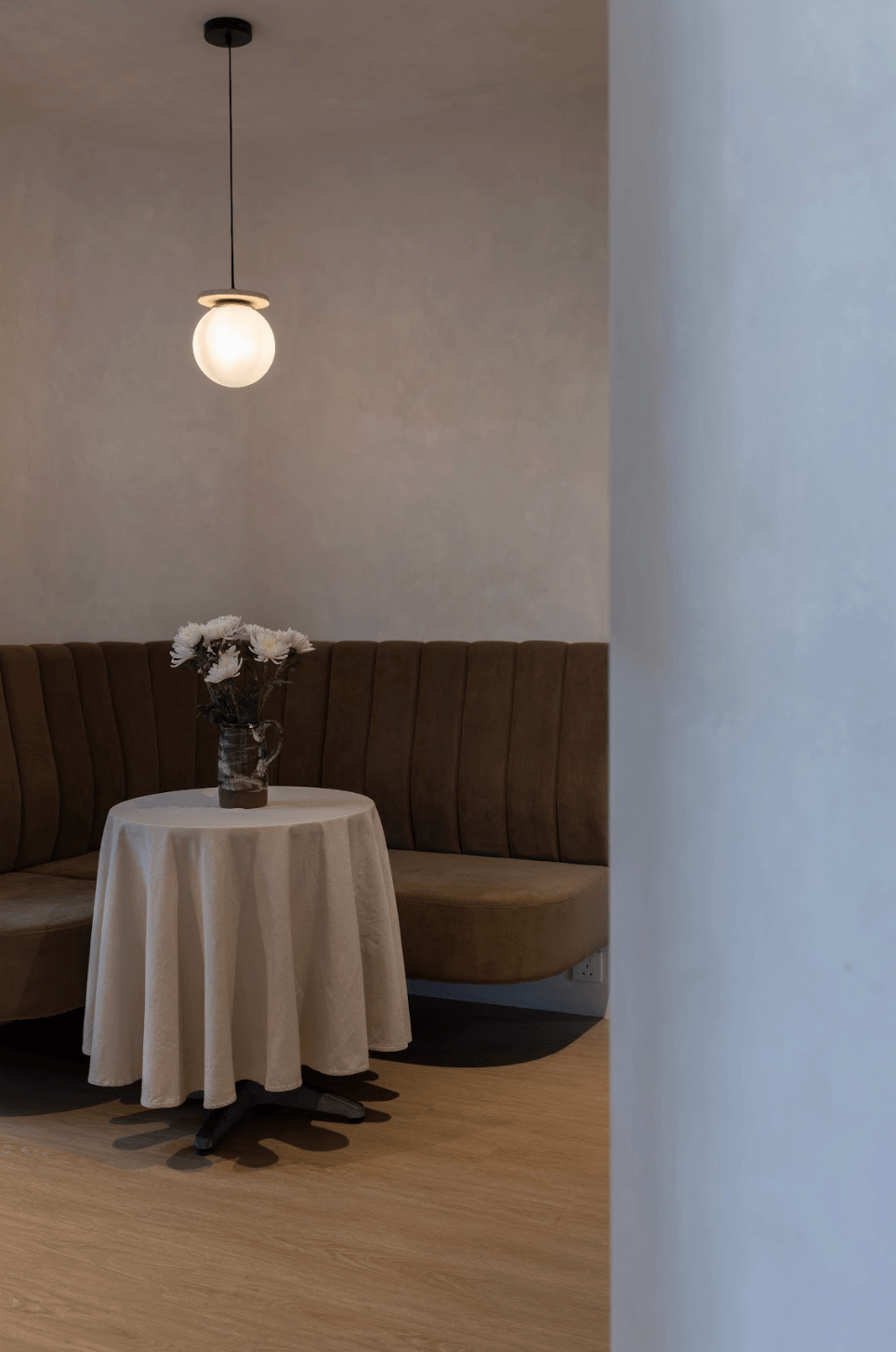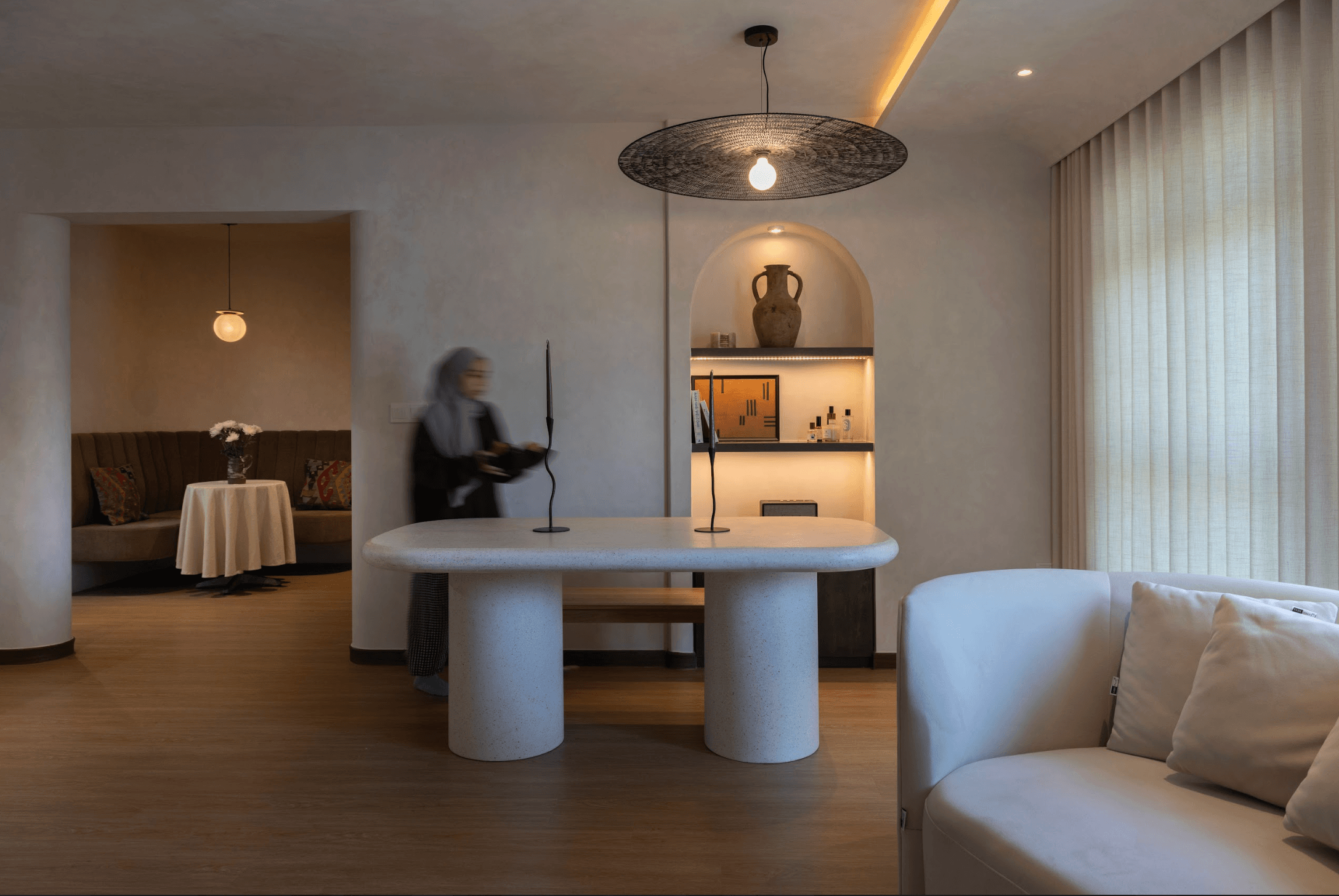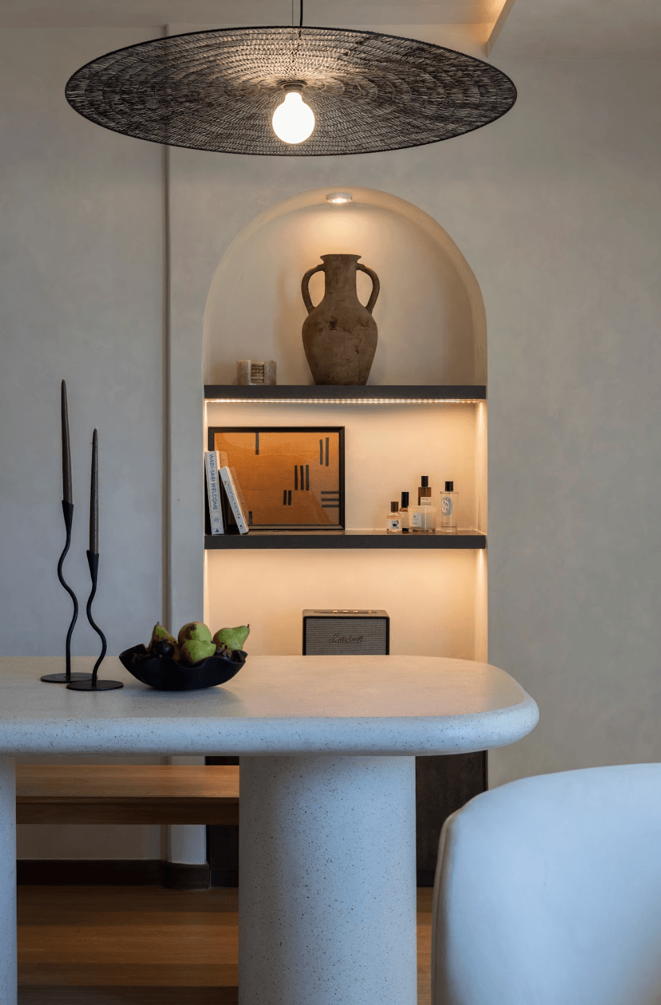 The design plays with contrast and cohesion — marrying textured, raw materials with refined architectural details. We paired travertine-look sintered stone and microcement-effect laminates with subtle steel accents in the open shelves and dining nook to bring depth and quiet sophistication. To soften the edges, we introduced curves throughout — from rounded pillars, curved corners, and top-hung cabinetry, to a custom arched ceiling pelmet that conceals the curtain tracks. These gestures lend an organic softness, balancing form and function effortlessly.