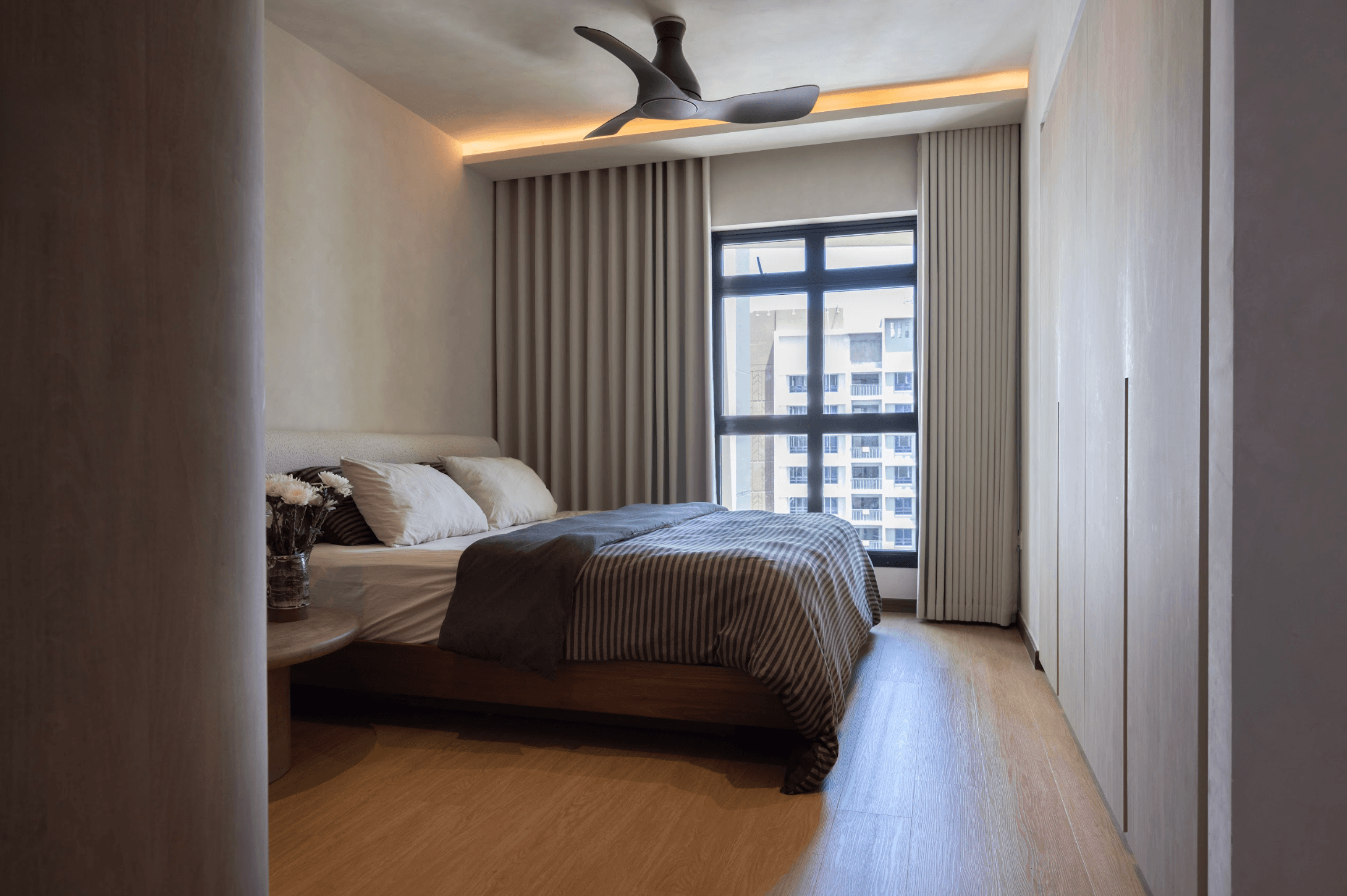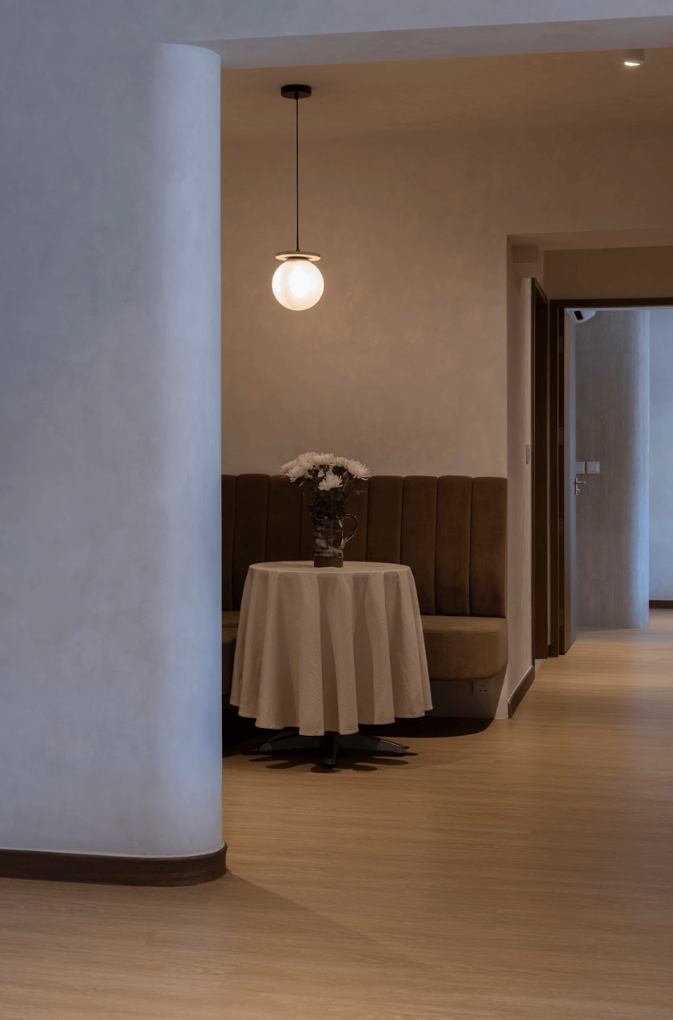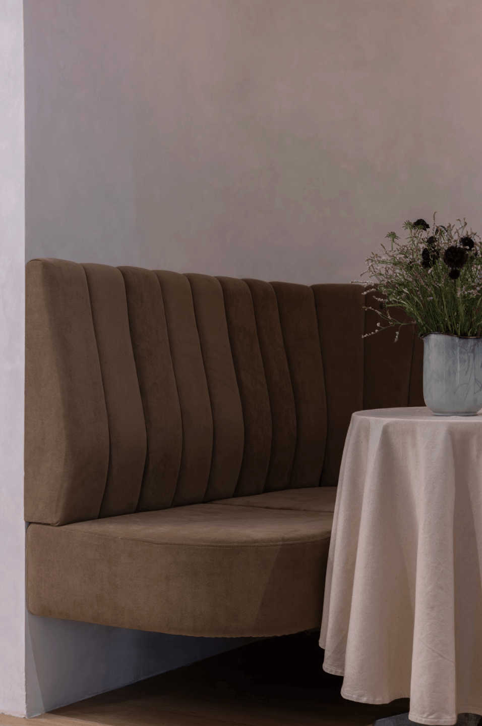 The design plays with contrast and cohesion — marrying textured, raw materials with refined architectural details. We paired travertine-look sintered stone and microcement-effect laminates with subtle steel accents in the open shelves and dining nook to bring depth and quiet sophistication. To soften the edges, we introduced curves throughout — from rounded pillars, curved corners, and top-hung cabinetry, to a custom arched ceiling pelmet that conceals the curtain tracks. These gestures lend an organic softness, balancing form and function effortlessly.