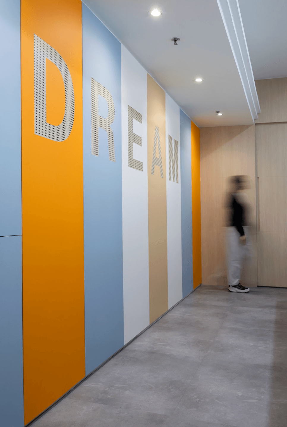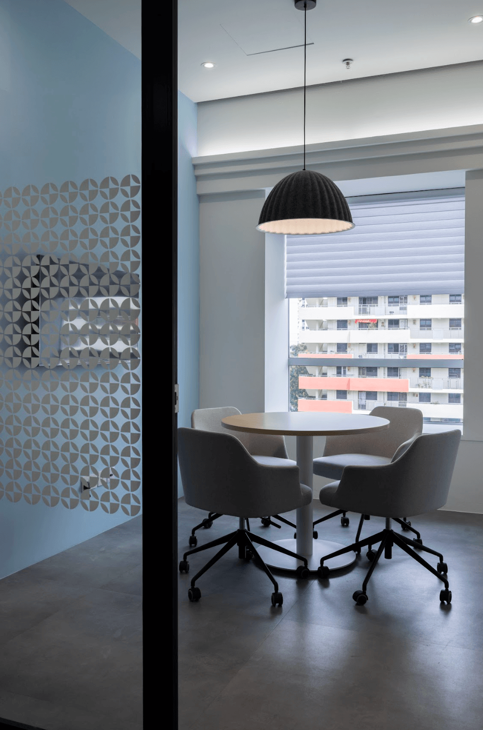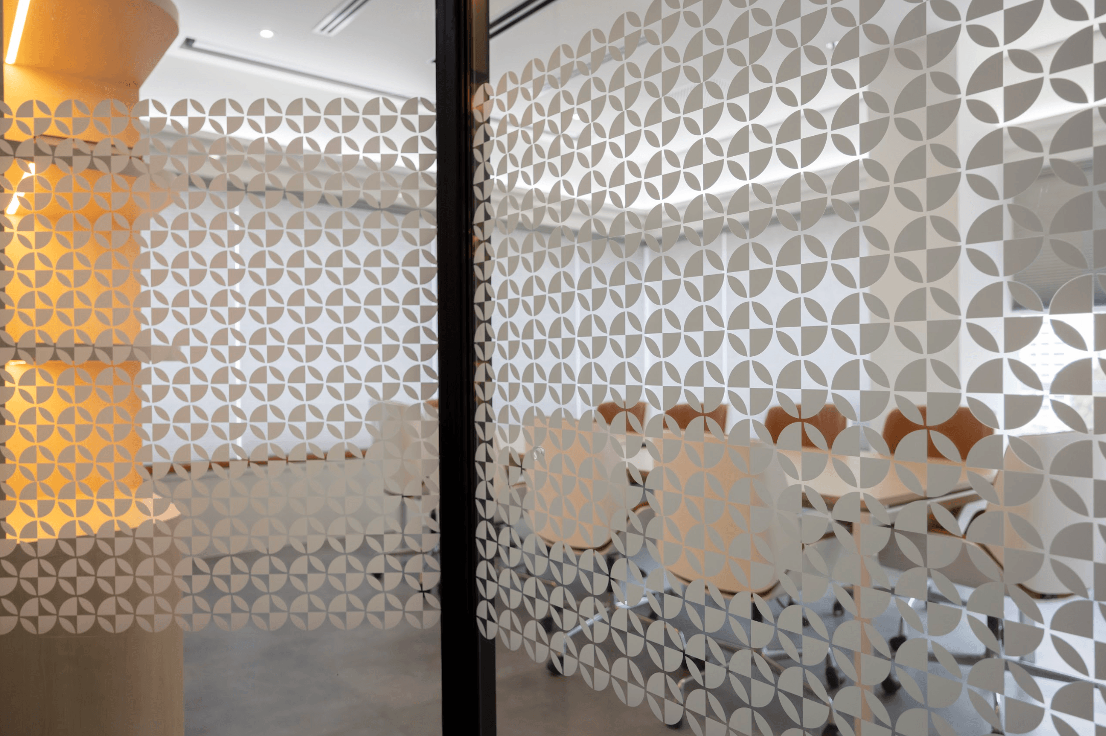 Light wood tones were introduced throughout the space to bring warmth and contrast from the grey vinyl flooring. A key feature of the design is the seamless concealment of the electrical box and back-door, achieved by integrating them into a feature wall that keeps the back area discreet. We also created a custom glass sticker pattern inspired by the company logo, offering both visual appeal and added privacy for the rooms. This redesign reflects our commitment to creating spaces that are both purposeful and beautifully crafted.